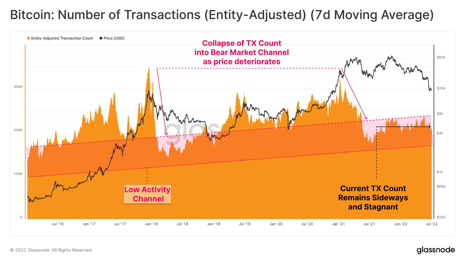 Address activity has fallen from over 1 million daily active addresses in November 2021 to around 870,000 per day over the past week. Similarly, active entities, a collation of multiple addresses owned by the same person or institution, are now approximately 244,000 per day, which Glassnode says is around the “lower end of the ‘Low Activity’ channel typical of bear markets.”