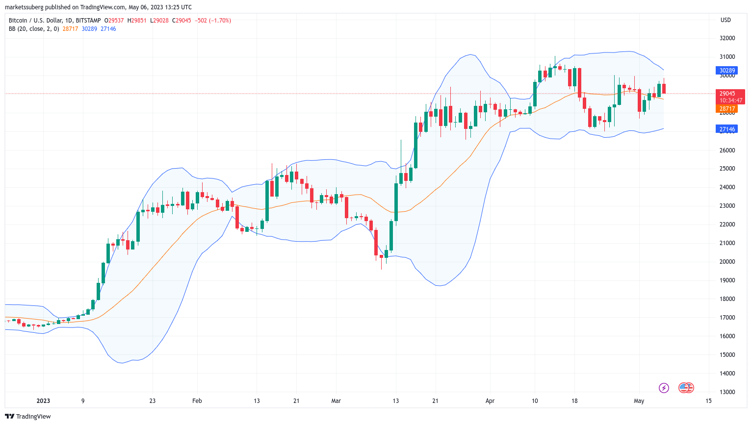 Subsequently, analyst CryptoCon suggested that low-timeframe Bollinger Bands norms remained intact despite Bitcoin’s comedown from local highs of $31,000.