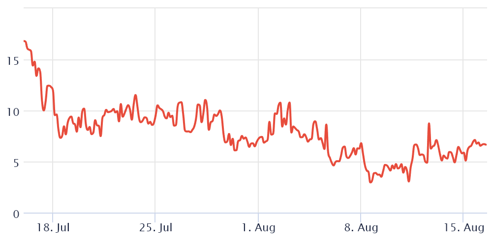 As displayed above, the 25% delta skew has barely moved since Aug. 11, oscillating between 5% and 7% most of the time. This range is considered neutral because options traders are pricing a similar risk of unexpected pumps or dumps.