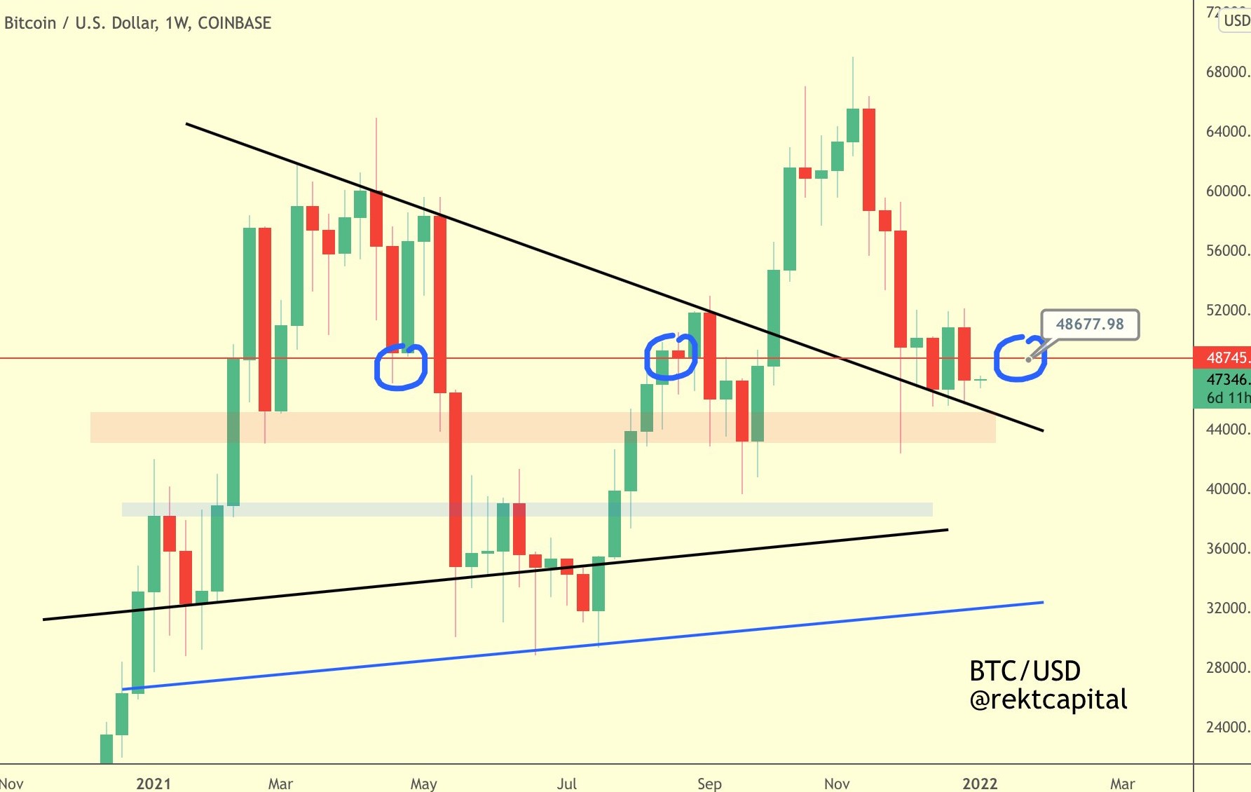 Analysis of the weekly price performance for BTC was addressed by crypto trader and pseudonymous Twitter user Rekt Capital, who posted the following chart highlighting the main support and resistance area at $48,670.