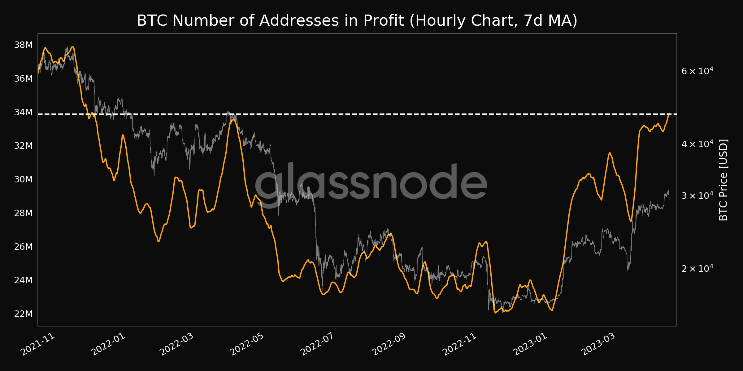 The number of BTC addresses in profit hit 16-month highs on April 14, according to data from on-chain analytics firm Glassnode.