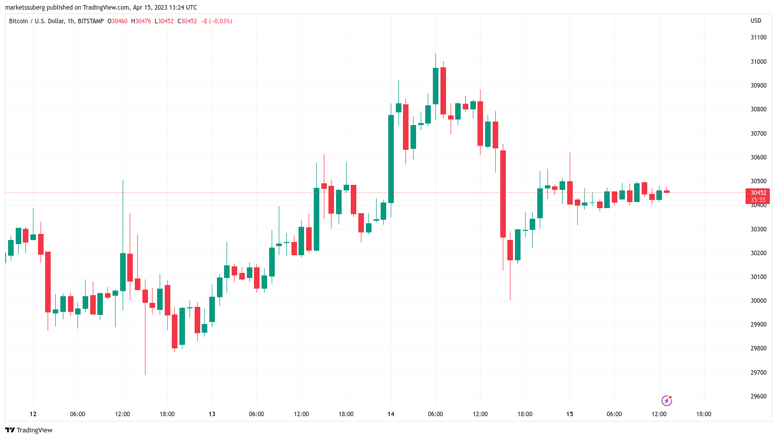 Data from Cointelegraph Markets Pro and TradingView showed BTC/USD hovering near $30,500 on April 15.