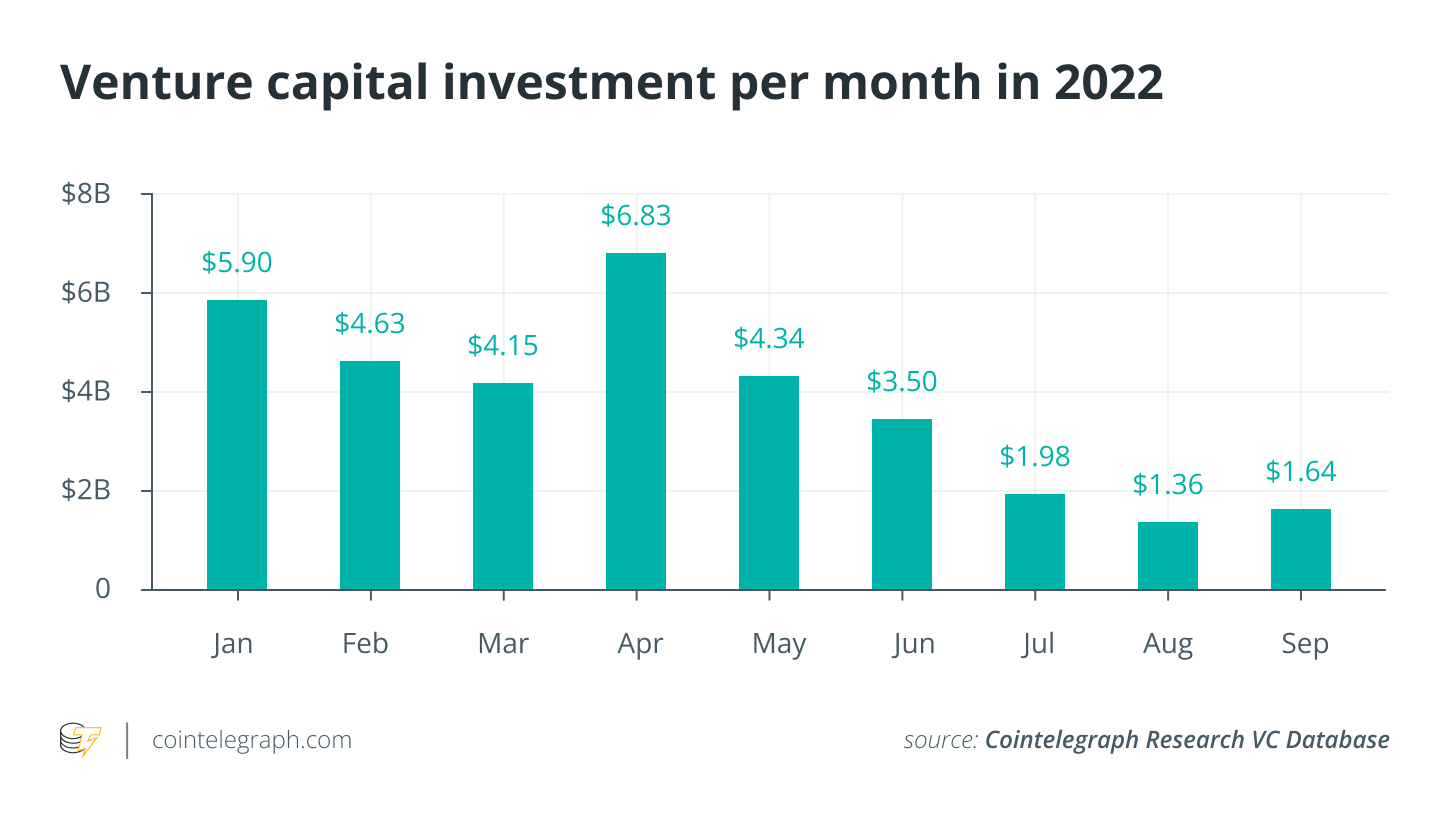 Venture capital is often a lagging indicator of market sentiment in traditional markets. In 2021, the blockchain space saw continuous increases in capital inflows per quarter. In 2022, Q1 continued this trend, while Q2 began to show a slowdown in VC capital coming into the space. However, September saw a 20.6% uptick in the capital investment of VCs over 93 deals throughout the month.