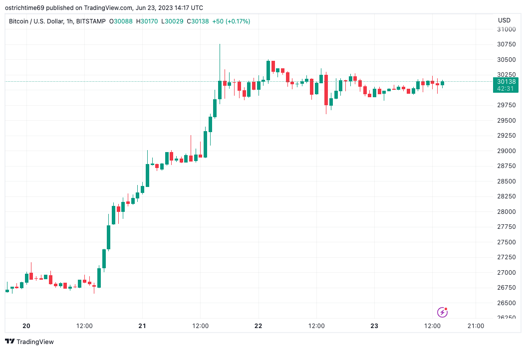 Data from Cointelegraph Markets Pro and TradingView showed BTC price action continuing to hover around $30,000.