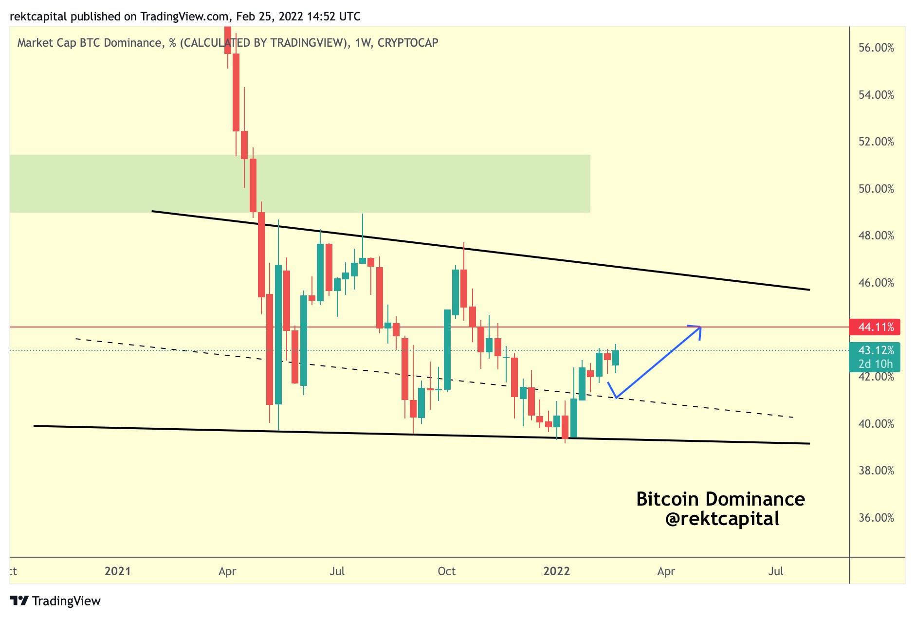 “Dominance is still on track for further upside, though this upward progression towards the red level may extend into early March,” trader and analyst Rekt Capital commented on a chart about Bitcoin’s market cap presence versus altcoins.