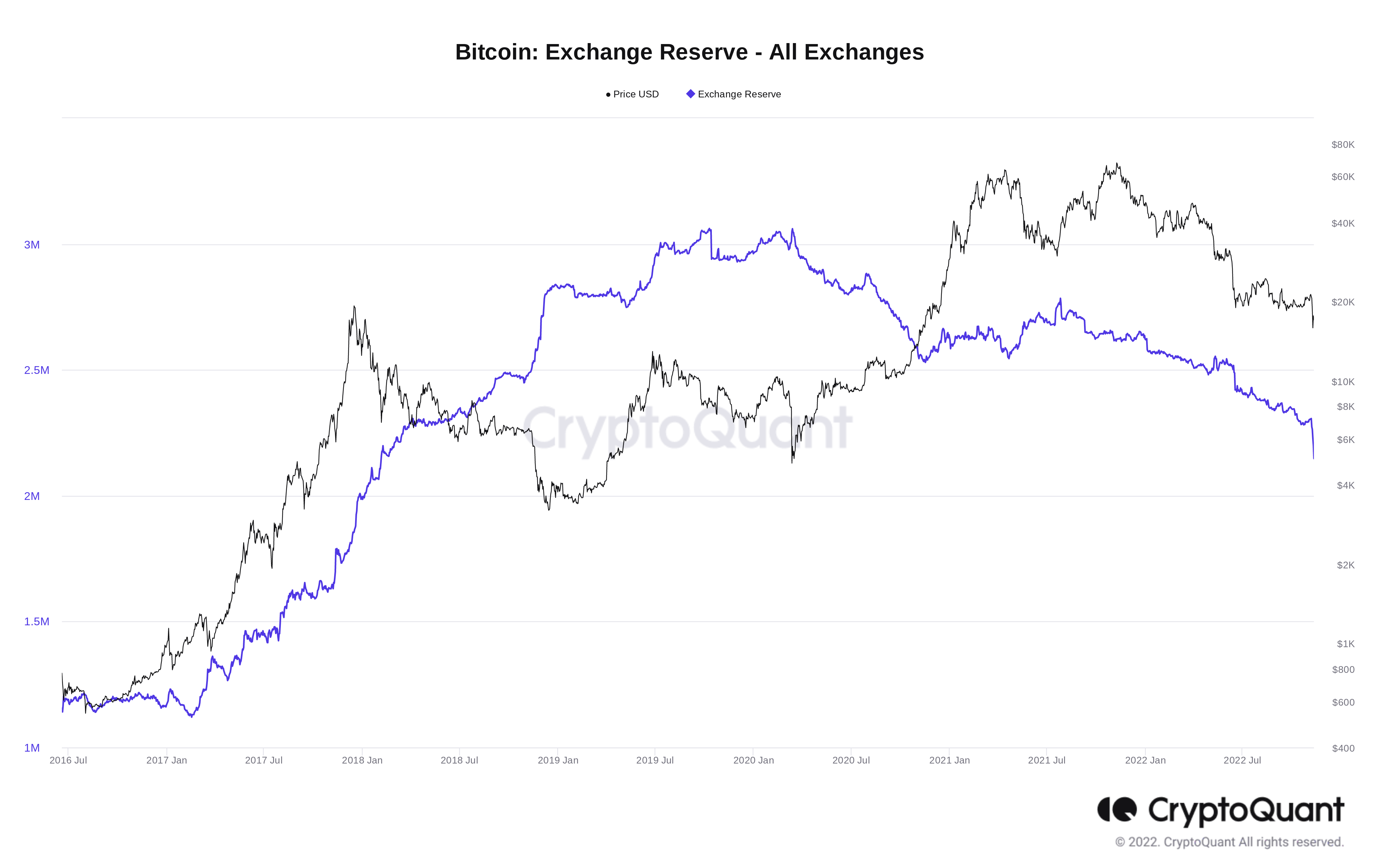 According to data from on-chain analytics platform CryptoQuant, the BTC balance of major exchanges is now at its lowest since February 2018.