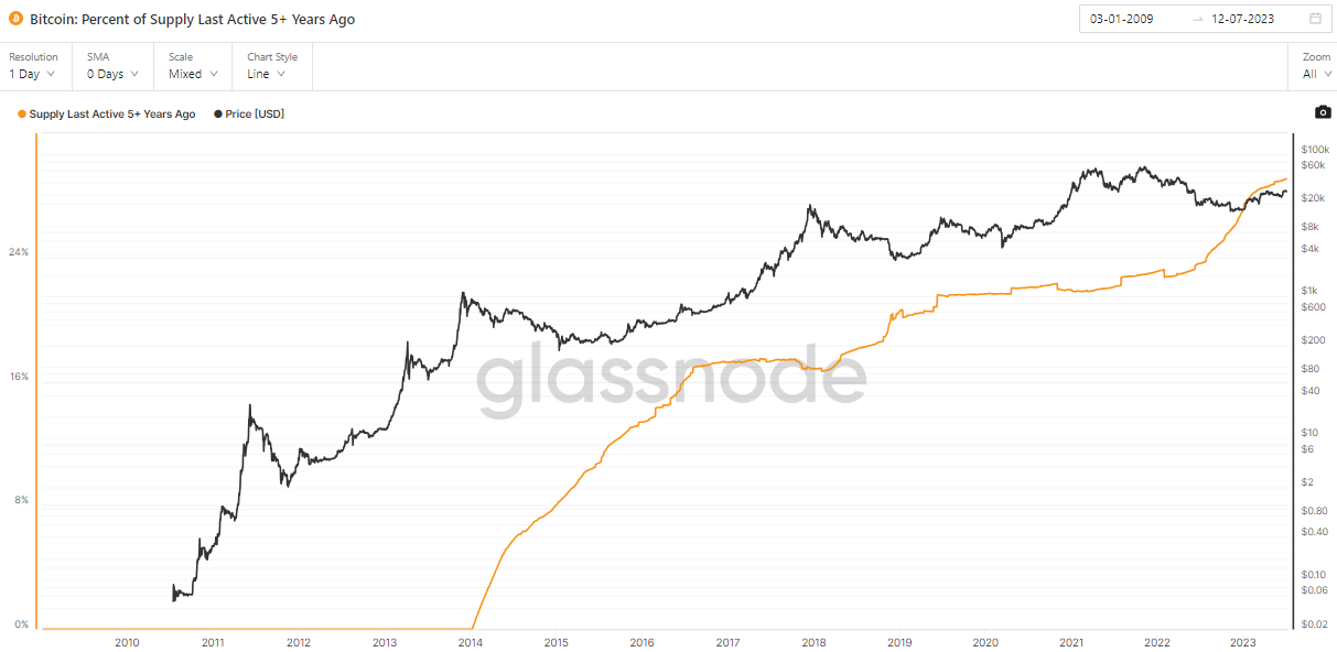 Metrika, ktorá sleduje neaktívne mince na bitcoinovom blockchaine nedávno zaznamenala nové historické maximum. Konkrétne sleduje na základe údajov Glassnode mince, ktoré sú neaktívne minimálne 5 rokov. Na prvý pohľad sa zdá, že tento rekord je pozitívny, no opak je pravdou.