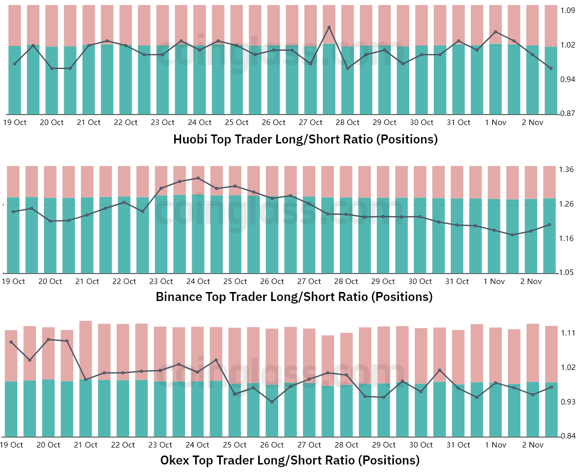 For instance, the Binance traders’ ratio improved somewhat from the 1.25 start, but then finished the period below its starting level at 1.22. Meanwhile, Huobi displayed a modest decrease in its long-to-short ratio because the indicator moved from 1.03 to 1.00 in the seven days until Oct. 29.