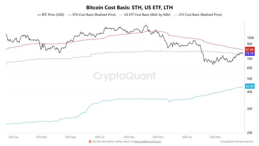 US spot ETF positioning adds an institutional cost basis level. The weighted average cost basis of US spot Bitcoin ETFs sits near $76,700, placing the price close to a key area of recent institutional accumulation. The short-term holder’s cost basis is near $81,800, a level at which investors could build more conviction if the price holds above it.