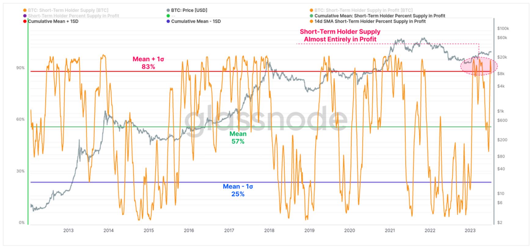 According to Glassnode, 88% of short-term holders’ supply is in profit as this “cohort is becoming increasingly likely to spend and take profits.”