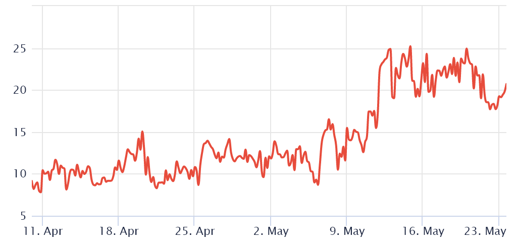 Still, miners are not showing signs of capitulation even as their wallets’ movements to exchanges hit a 30-day low on May 23, according to on-chain analytics platform Glassnode.