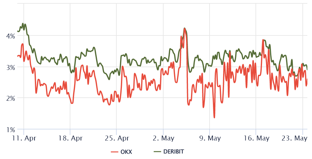 According to the above data, Bitcoin’s basis indicator has been below 4% since April 12. This reading is typical of bearish markets, but the fact that it has not deteriorated after the sell-off down to $25,400 on May 12 is encouraging.