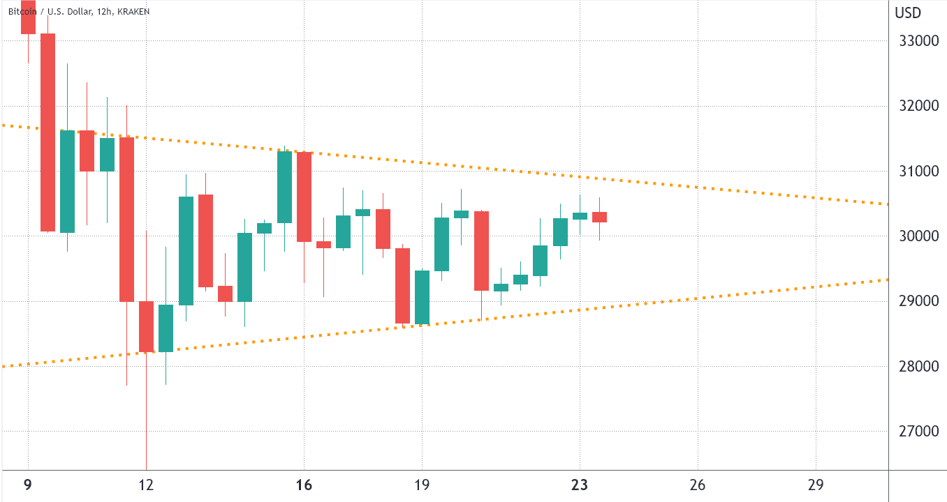 https://images.cointelegraph.com/images/840_aHR0cHM6Ly9zMy5jb2ludGVsZWdyYXBoLmNvbS91cGxvYWRzLzIwMjItMDUvODA5NDg1MGYtNzY1Zi00OGM0LWI5NjgtYjJiYmE5OThjYzQyLmpwZw==.jpgThe Bitcoin (BTC) chart has formed a symmetrical triangle, which currently holds a tight range from $28,900 to $30,900. This pattern has been holding for nearly two weeks and could potentially extend for another two weeks before price makes a more decisive movement.