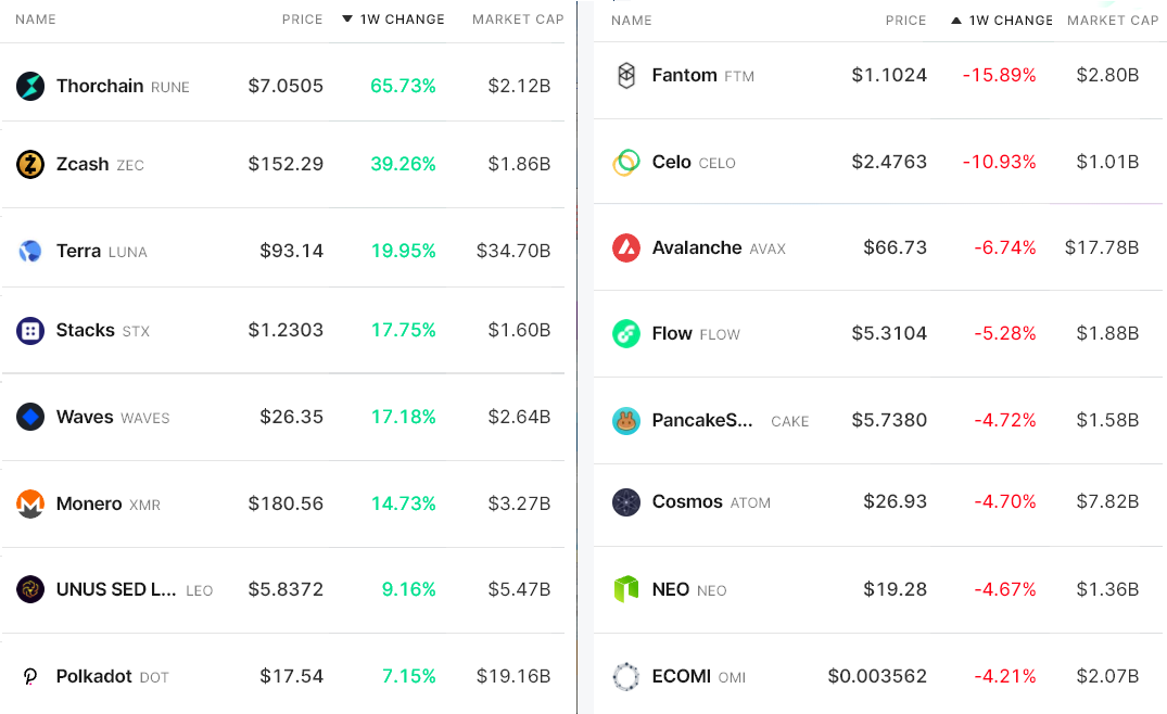Bitcoin presented a 2.5% gain over the previous seven days, while the vice-leader Ether (ETH) increased 3.6%. However, they were no match for the altcoin rally that happened. Below are the top gainers and losers among the 80 largest cryptocurrencies by market capitalization.