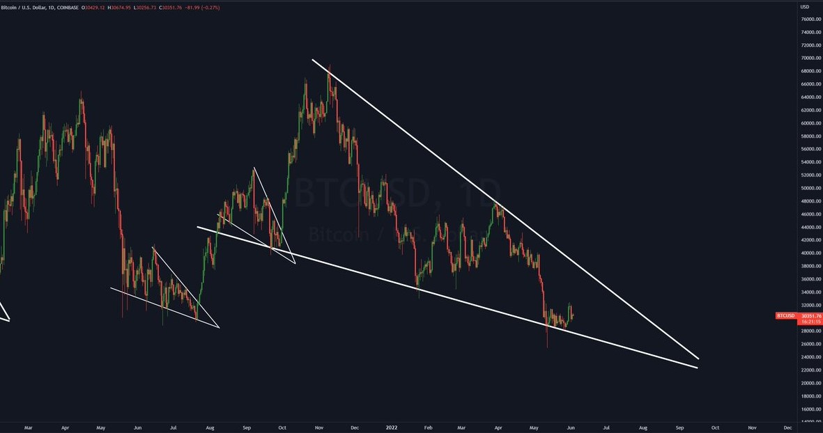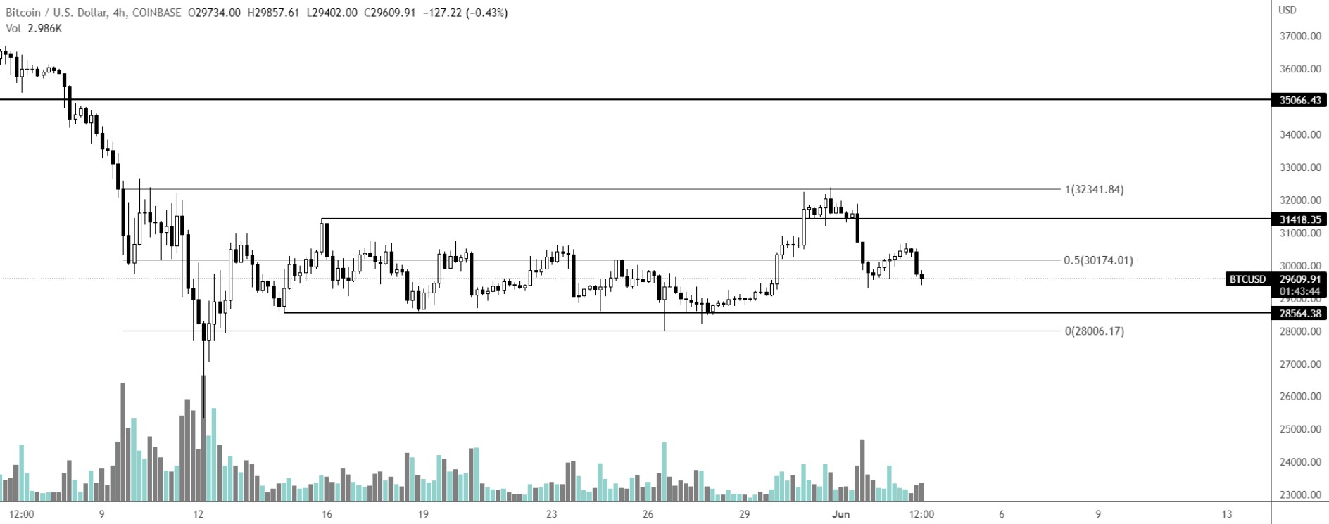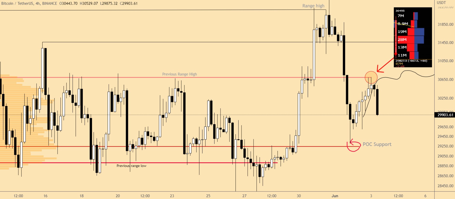 “Looks like the run to 32K was only a deviation. Was not expecting the previous range high to act as such strong a resistance. Expecting support at PoC [point of control] now and will Spots there.”
