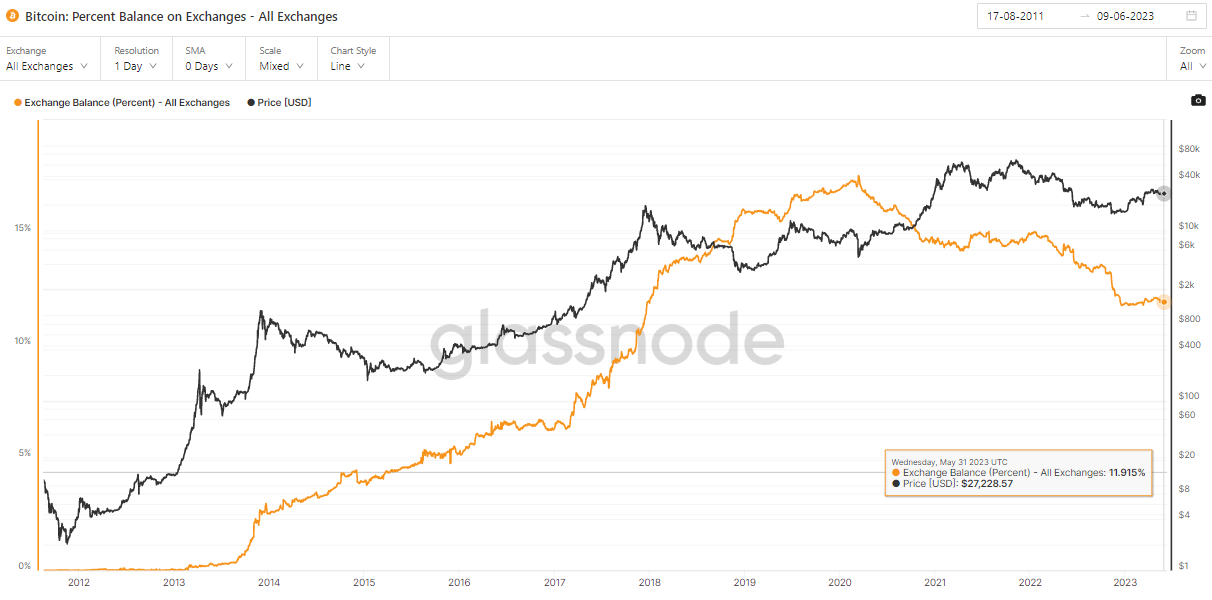Podľa údajov z Glassnode sa na burzách nachádza v súčasnosti iba 11,91% BTC z celkového počtu vyťažených mincí. Pre porovnanie, v marci 2020 tento podiel dosahoval 17,50%, čo je pokles o viac ako 5,50% (približne 900 000 BTC) v priebehu len 3 rokov.