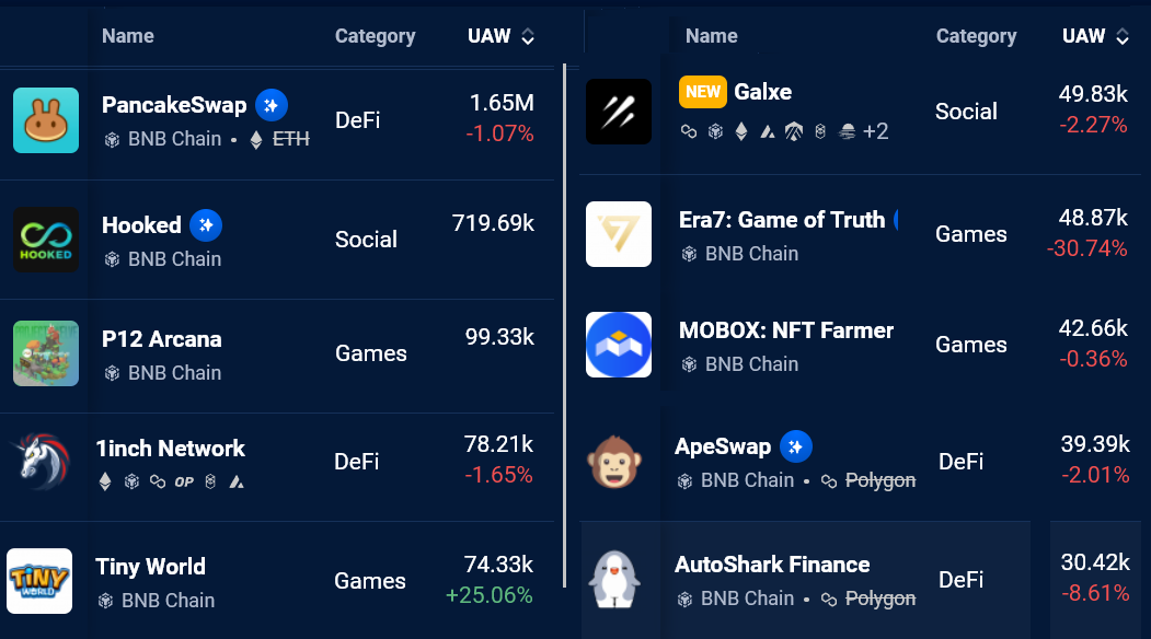 Nov. 2 data from DappRadar shows that the number of BNB Chain network addresses interacting with decentralized applications declined by 5% compared to the previous month. In comparison, Ethereum posted a 5% decrease, and Solana users dropped by 13% in the same period.