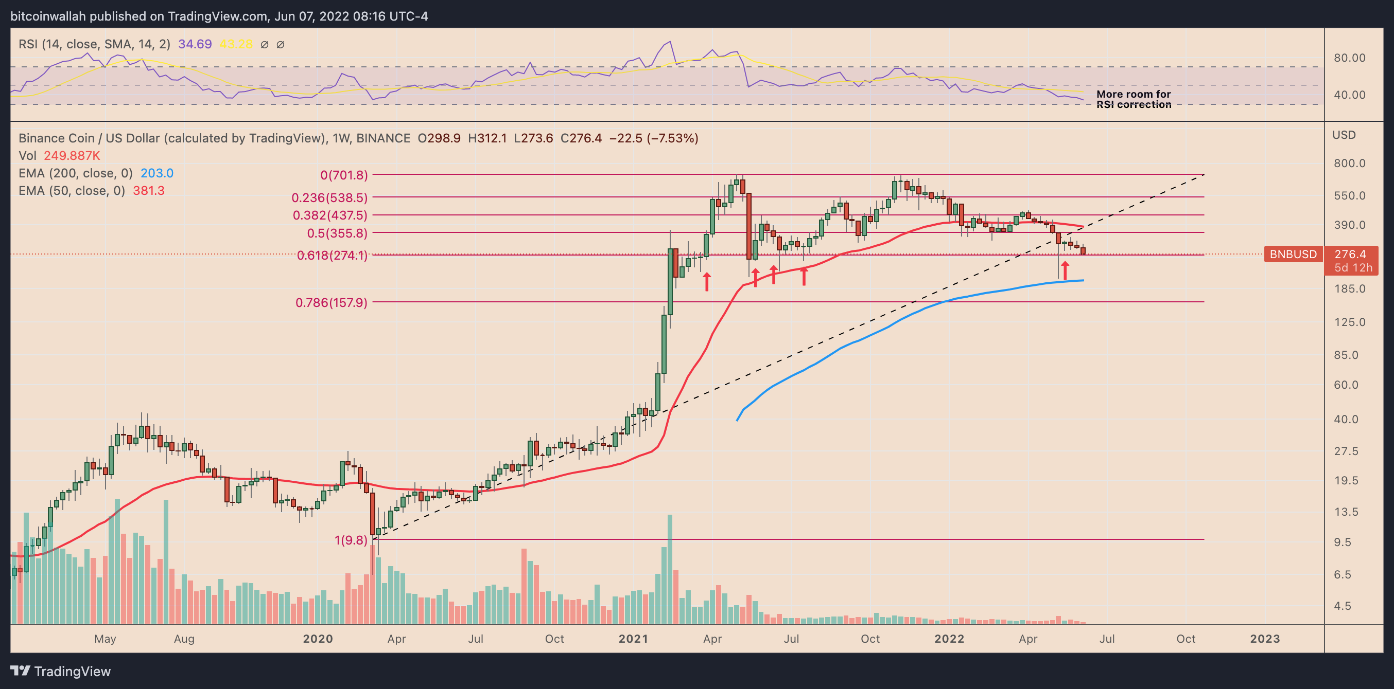 Meanwhile, a further drop below the 200-week EMA could have BNB eye the 0.786 Fib line near $160 as its support, down by 40% from today’s price.