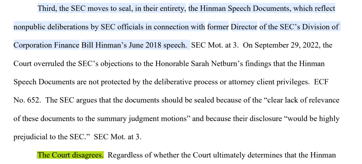 The U.S. Securities and Exchange Commission filed the motion to seal the documents on Dec. 22, 2022, arguing that its mission outweighed the “public’s right” to access documents that have “no relevance” to the Court’s summary judgment decision, among other arguments.