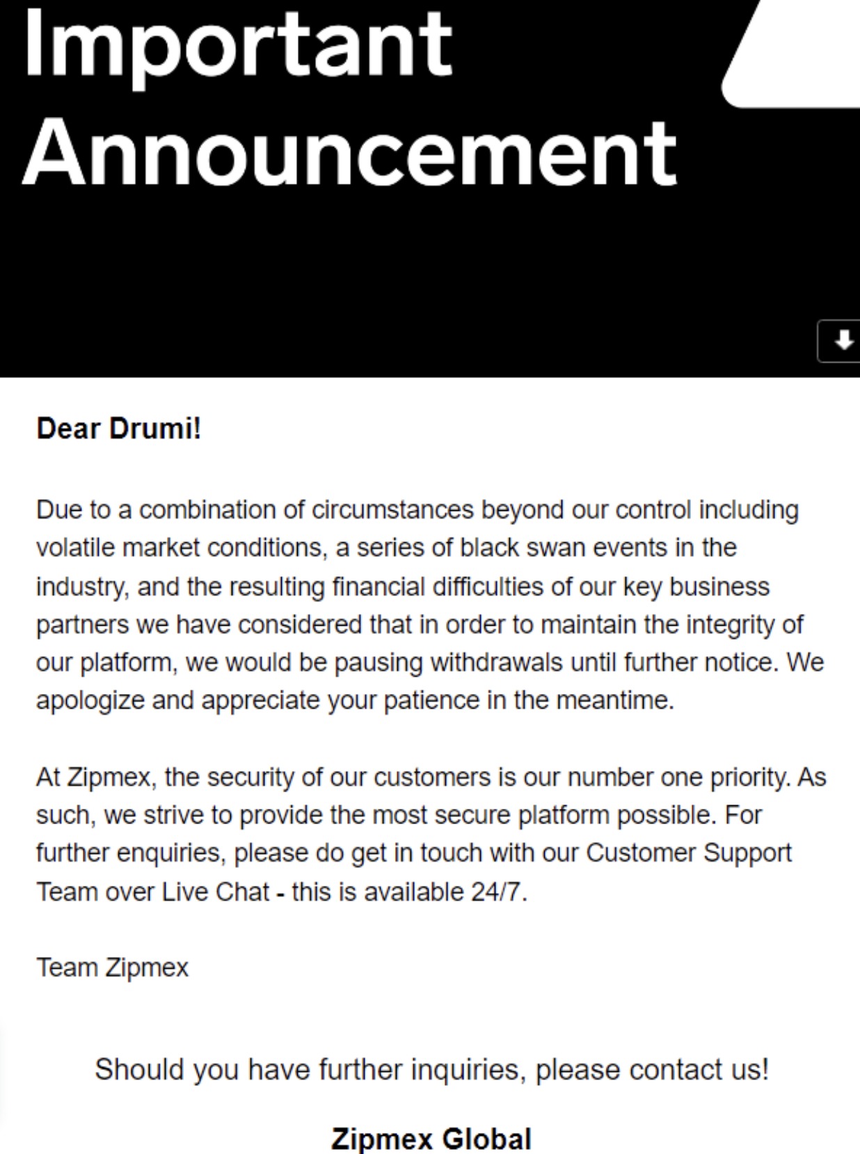 Due to a combination of circumstances beyond our control including volatile market conditions, and the resulting financial difficulties of our key business partners, to maintain the integrity of our platform, we would be pausing withdrawals until further notice.