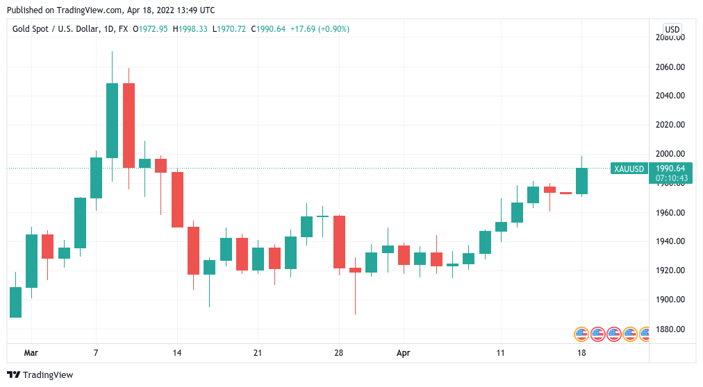 After climbing throughout the past week, XAU/USD crept up on the $2,000 mark again, coming within $2 of the resistance level before retreating to around $1,990.
