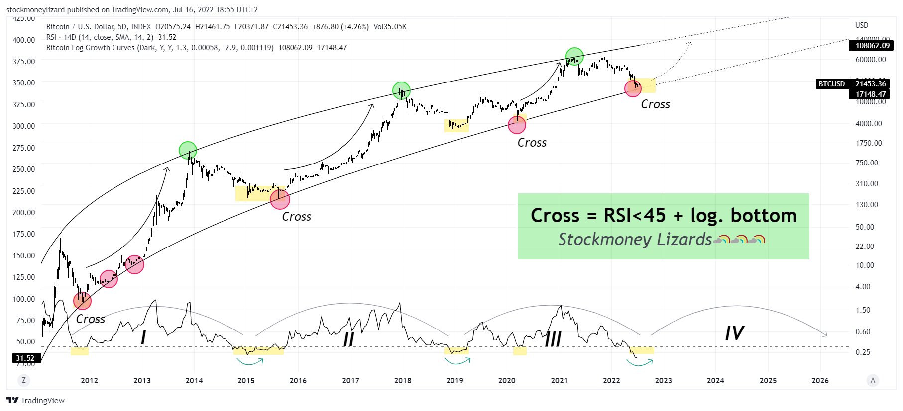 “RSI below 45 and logaritmic bottom showed a great reversal in the past, followed by a crazy bull run. Cross = RSI<45 + log. Bottom.”