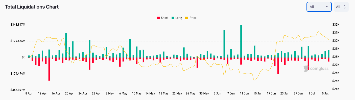 According to data from monitoring resource CoinGlass, combined long and short liquidations on BTC stood at $43 million for July 6. Cross-crypto liquidations totaled around $120 million.