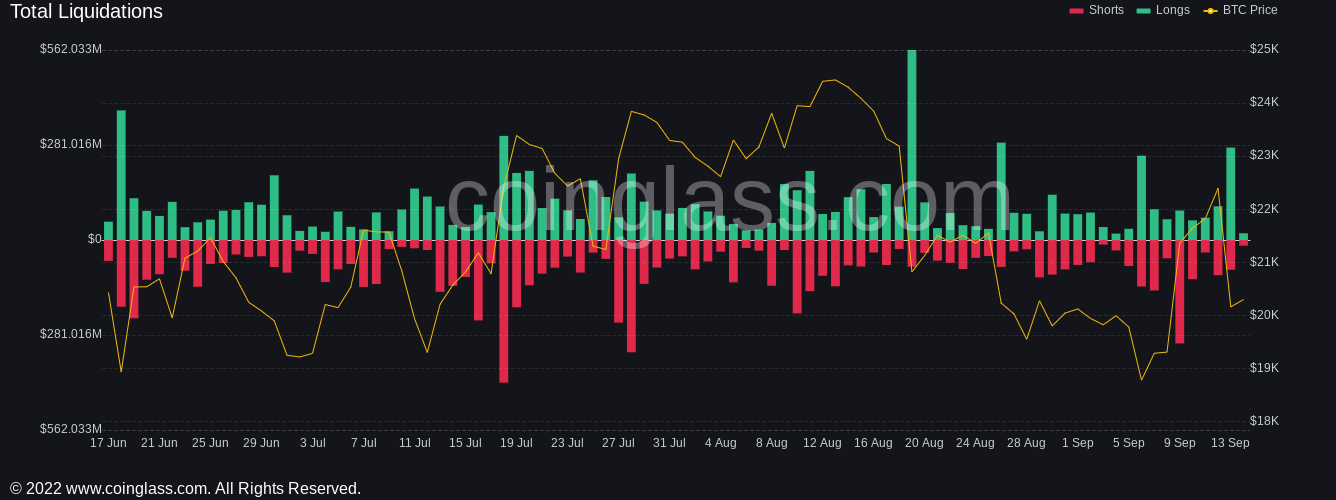 At the time of writing, cross-market crypto liquidations totaled $355 million, with Sep. 13 forming one of the largest long liquidation events in recent weeks.
