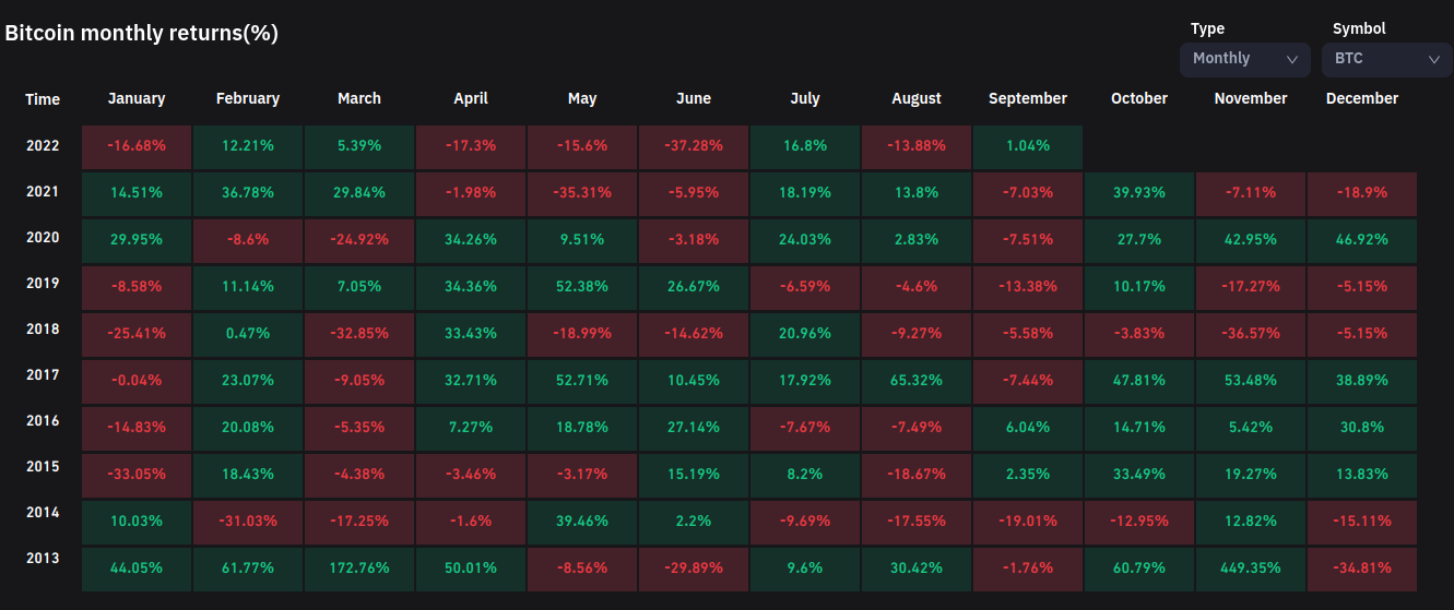 The sell-off thus left BTC/USD up just 1% for the month of September, which was nonetheless still the first “green” September since 2016, Coinglass showed.