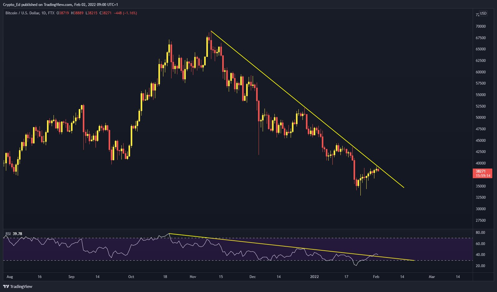 An accompanying chart shows BTC/USD fighting to exit its own downtrend, with RSI already notionally free.