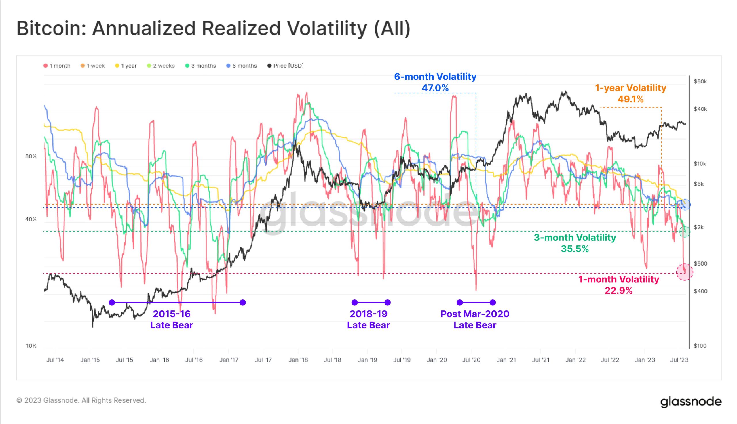 “Realized volatility for Bitcoin has collapsed to historical lows,” Checkmate, lead on-chain analyst at Glassnode, continued at the weekend.