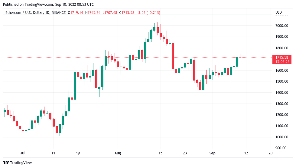 Of additional interest to traders was Ether (ETH), which managed its highest since Aug. 19 on the day before retracing.