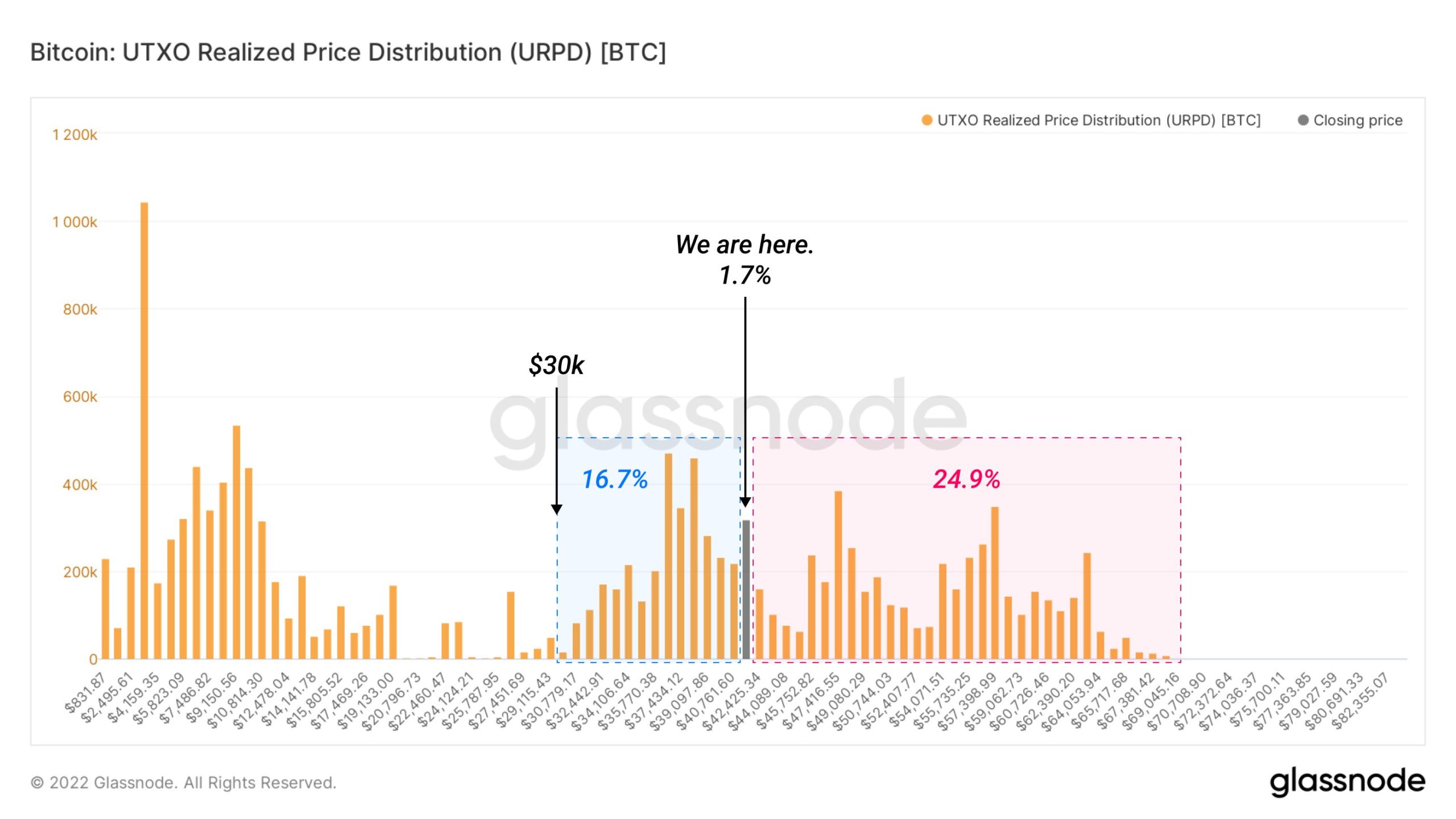 On the topic of profitability, almost 25% of the BTC supply remains underwater, meanwhile, compared with 16.7% of the supply purchased between $30,000 and $41,500.