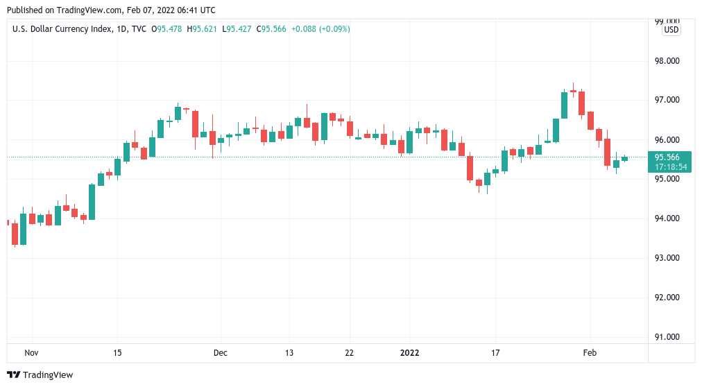 After passing 97 for the first time in over a year, DXY met with firm resistance and is now back below 95.6. Bar a brief dip in mid-January, this represents its lowest level since mid-November — just as BTC/USD was making its current $69,000 all-time highs.