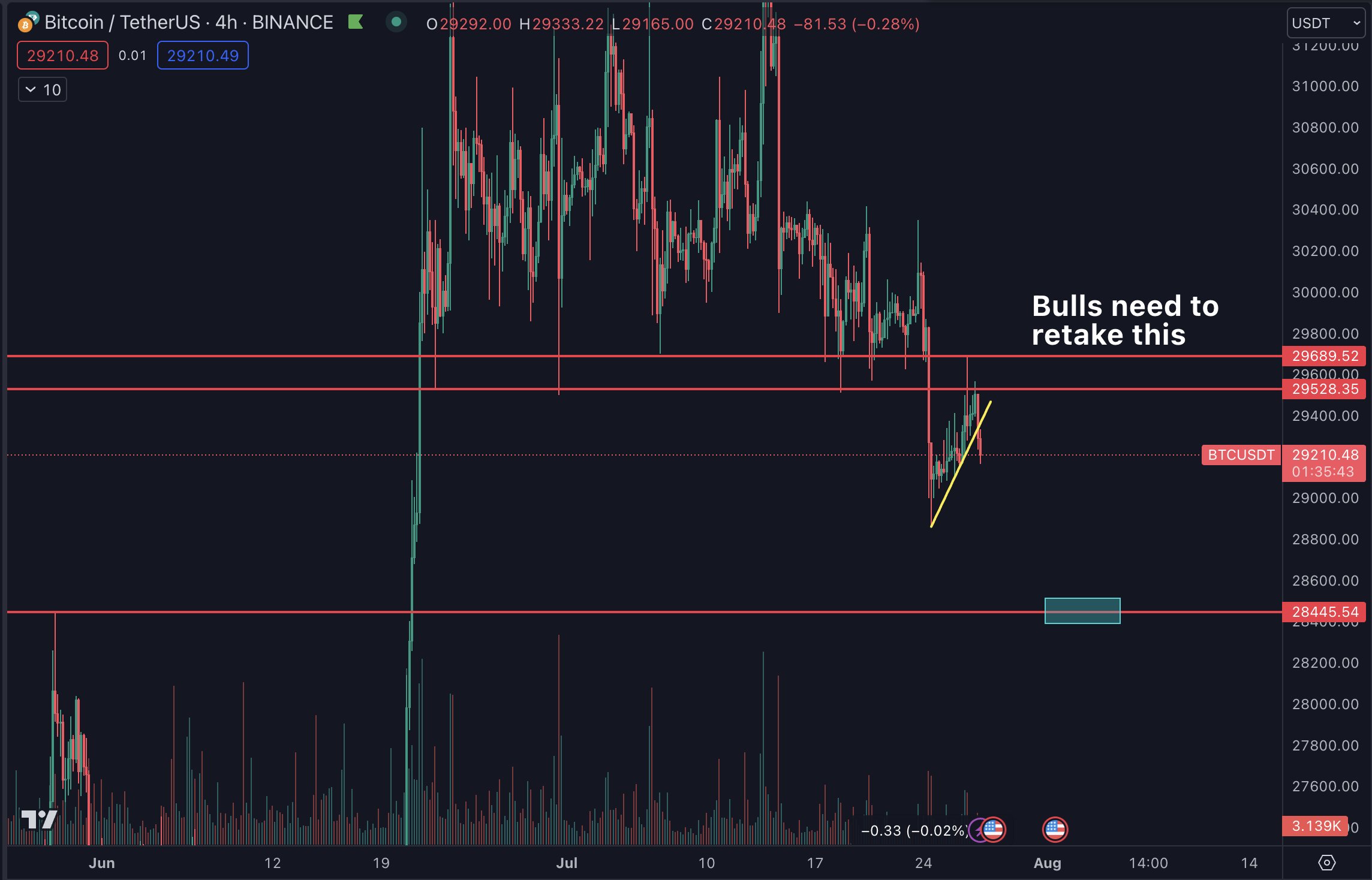 “Invalidation upon retaking $29.5K but there seems to be a lot of supply at that level and little spot bid to bring it up. Likely a choppy road on the way there.”