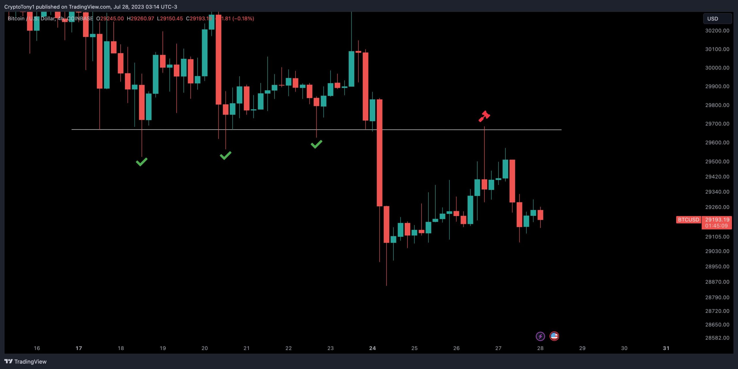 Popular trader Crypto Tony confirmed that he remained short BTC below $29,600.