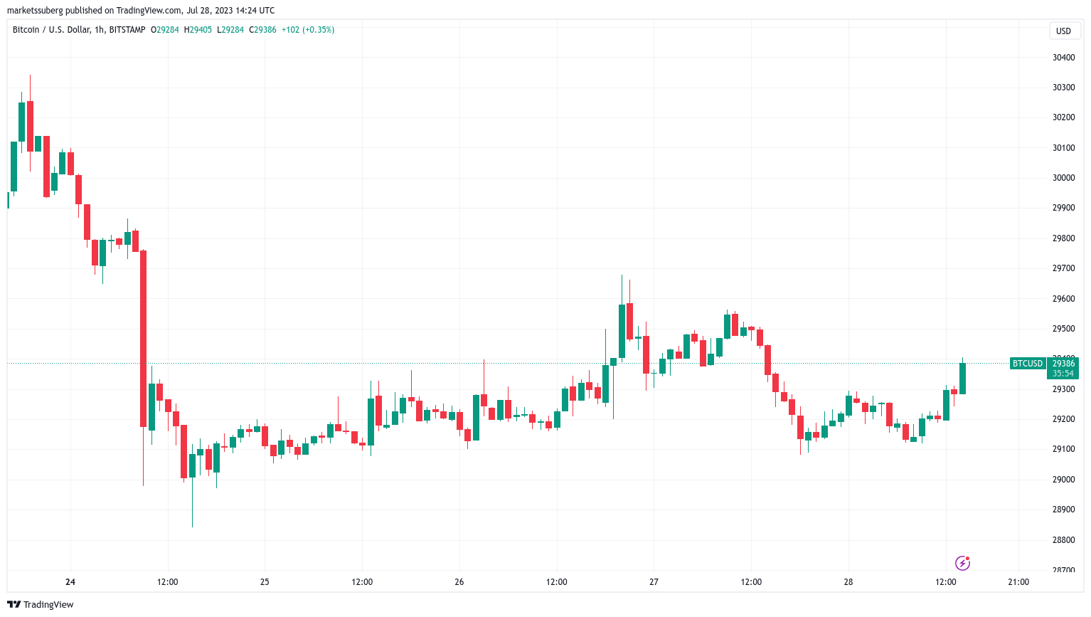 Much like the July 26 Fed interest rate hike and the July 27 U.S. Q2 GDP estimate, however, Bitcoin refused to turn on volatility, sticking between $29,000 and $29,500.
