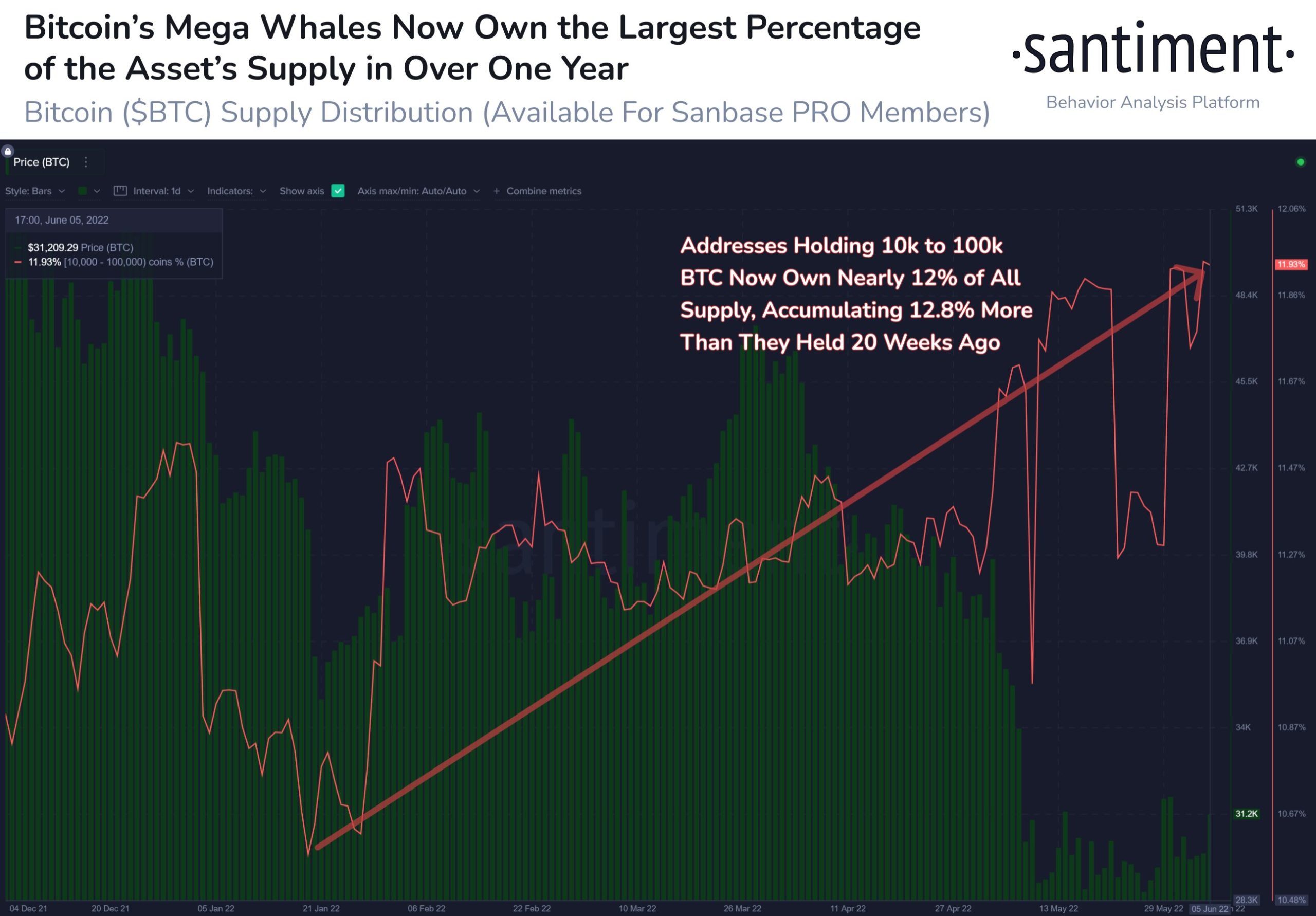 “The mega whale addresses of Bitcoin, comprised partially of exchange addresses, own their highest supply of $BTC in a year,” Santiment summarized on June 6.
