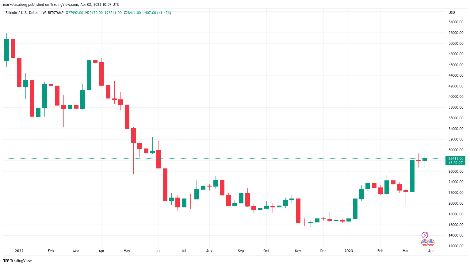 Bitcoin (BTC) stayed on course for its highest weekly close in ten months on April 2 as $28,000 held.