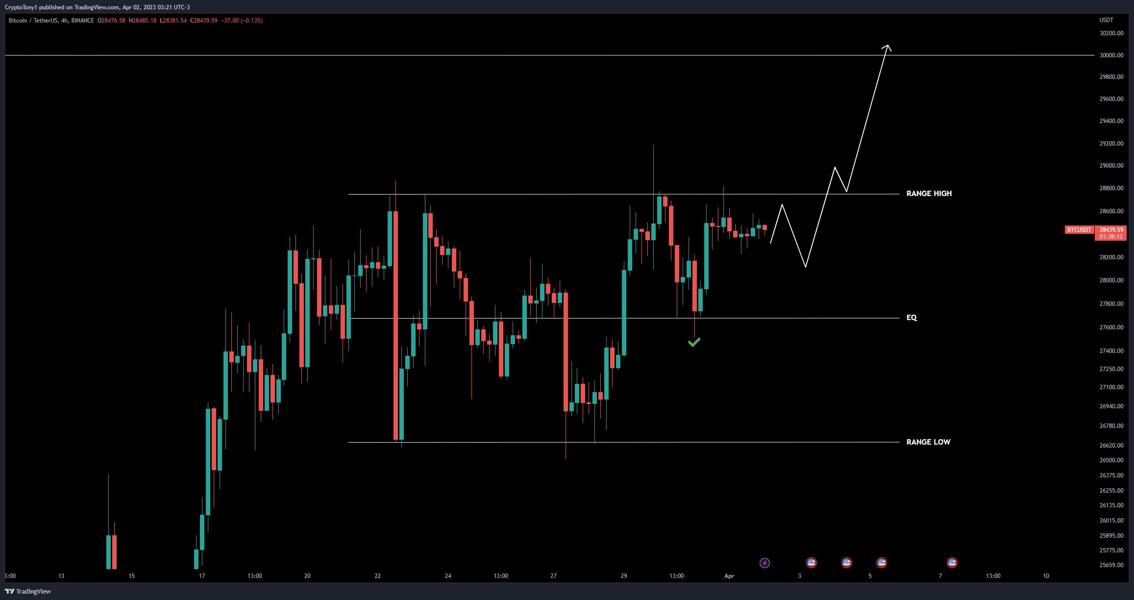 “Ranging this weekend it seems on the corn, and for continuation the bulls want to reclaim the range high at $28,750. Until the we chill,” Crypto Tony tweeted on the day.