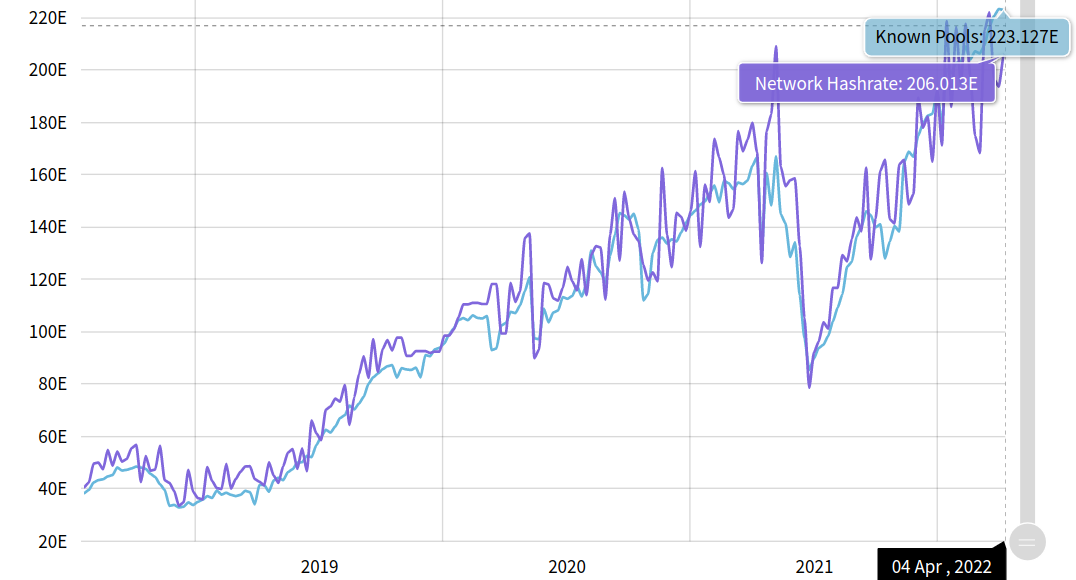 In what shows miners’ belief in the long-term profitability of participating in the network, hash rate is now at 223 exahashes per second (EH/s), according to data resource MiningPoolStats.