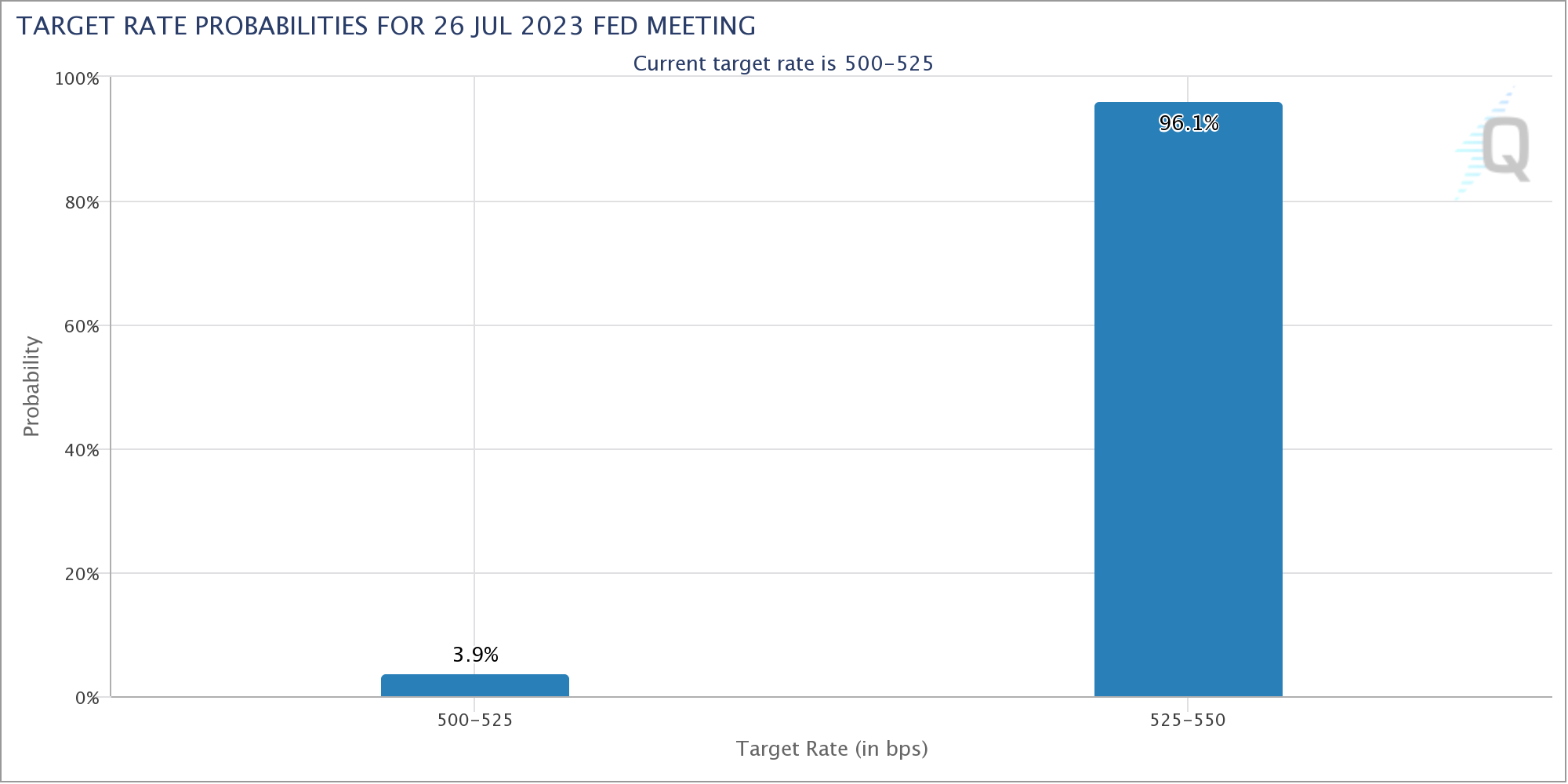 As of July 17, the odds of a 0.25% hike stand at a practically unanimous 96.1%.