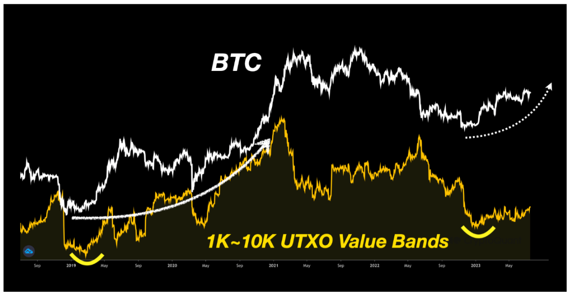 SignalQuant referenced the UTXO Value Bands metric, which shows whales gradually coming back to life in 2023 after a rapid retreat in the latter half of last year.