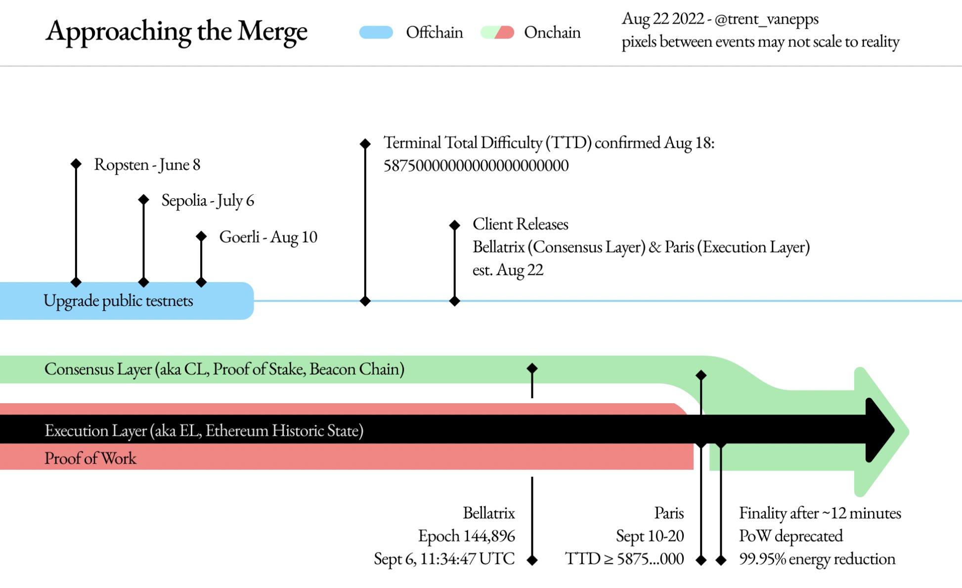 As part of the transition to Proof-of-Stake, the foundation said the Ethereum Network “must first be activated on the Beacon Chain with the Bellatrix upgrade,” an event expected to happen on Sept. 6, with the Merge likely following between Sept. 10-20. Core developers previously announced a tentative Merge date of Sept. 15 when the Total Terminal Difficulty, or TTD — the difficulty of the final mined block — will trigger the end of Proof-of-Work and the start of Proof-of-Stake.