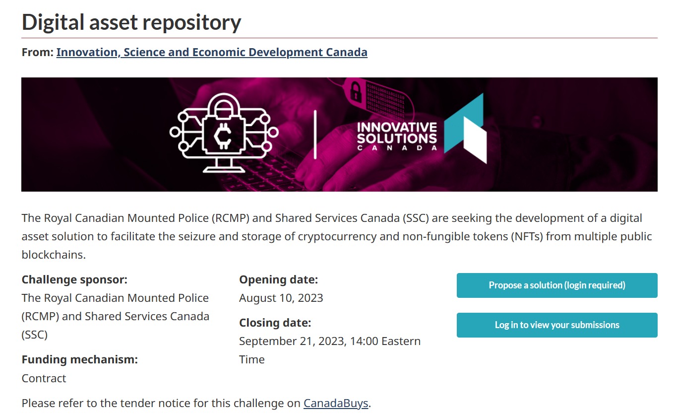 The Royal Canadian Mounted Police (RCMP) is seeking a digital asset solution to facilitate the seizure and storage of cryptocurrency and nonfungible tokens (NFTs). According to an announcement, a tender was opened for applications on Aug. 10 for a solution to store seized digital assets: