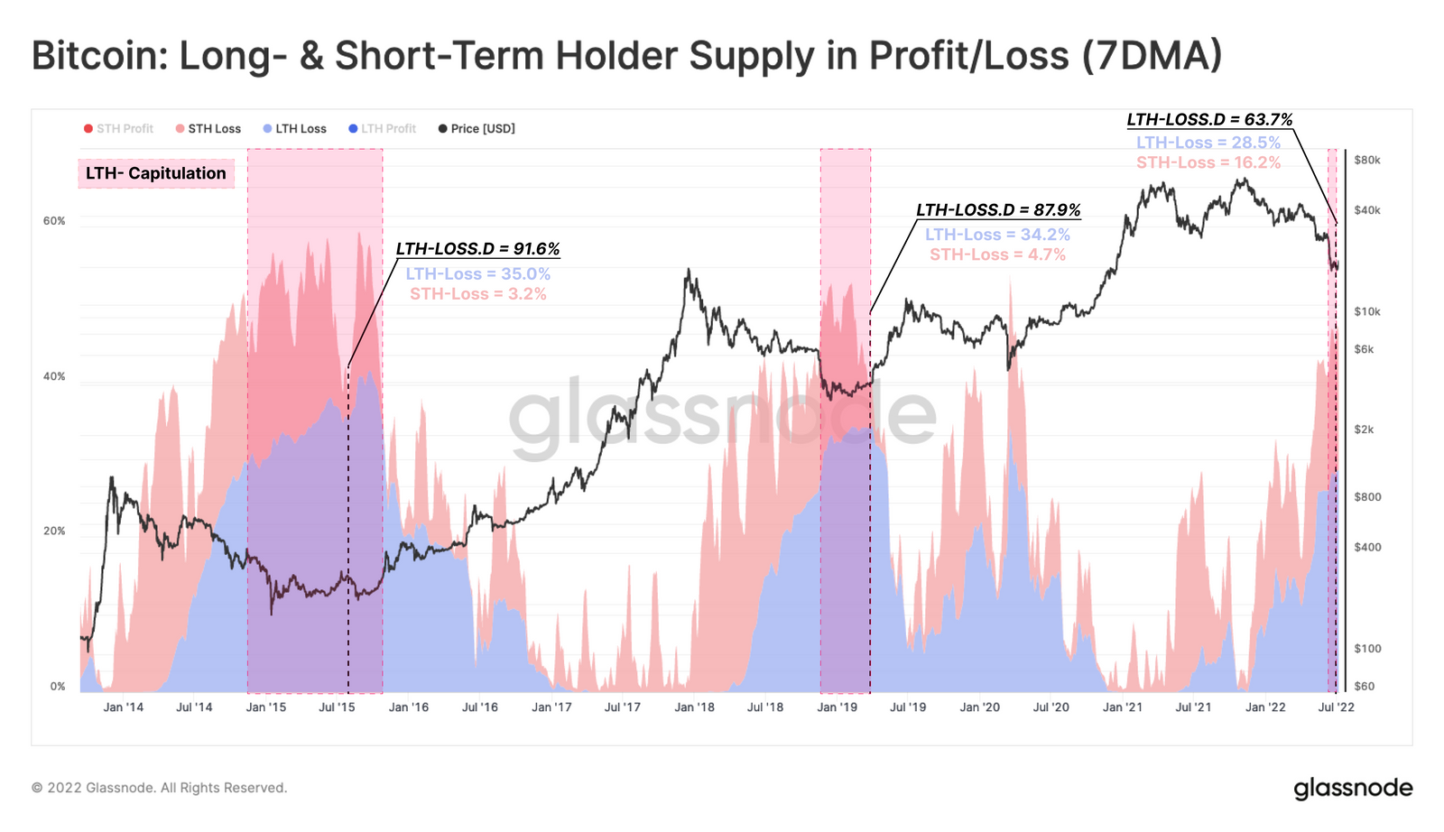 Glassnode made this assessment based on the observation that in previous bear markets in 2015 and 2018, LTH held over 34% of the Bitcoin (BTC) supply that was in unrealized loss. The STH proportion accounted for just 3% to 4%.
