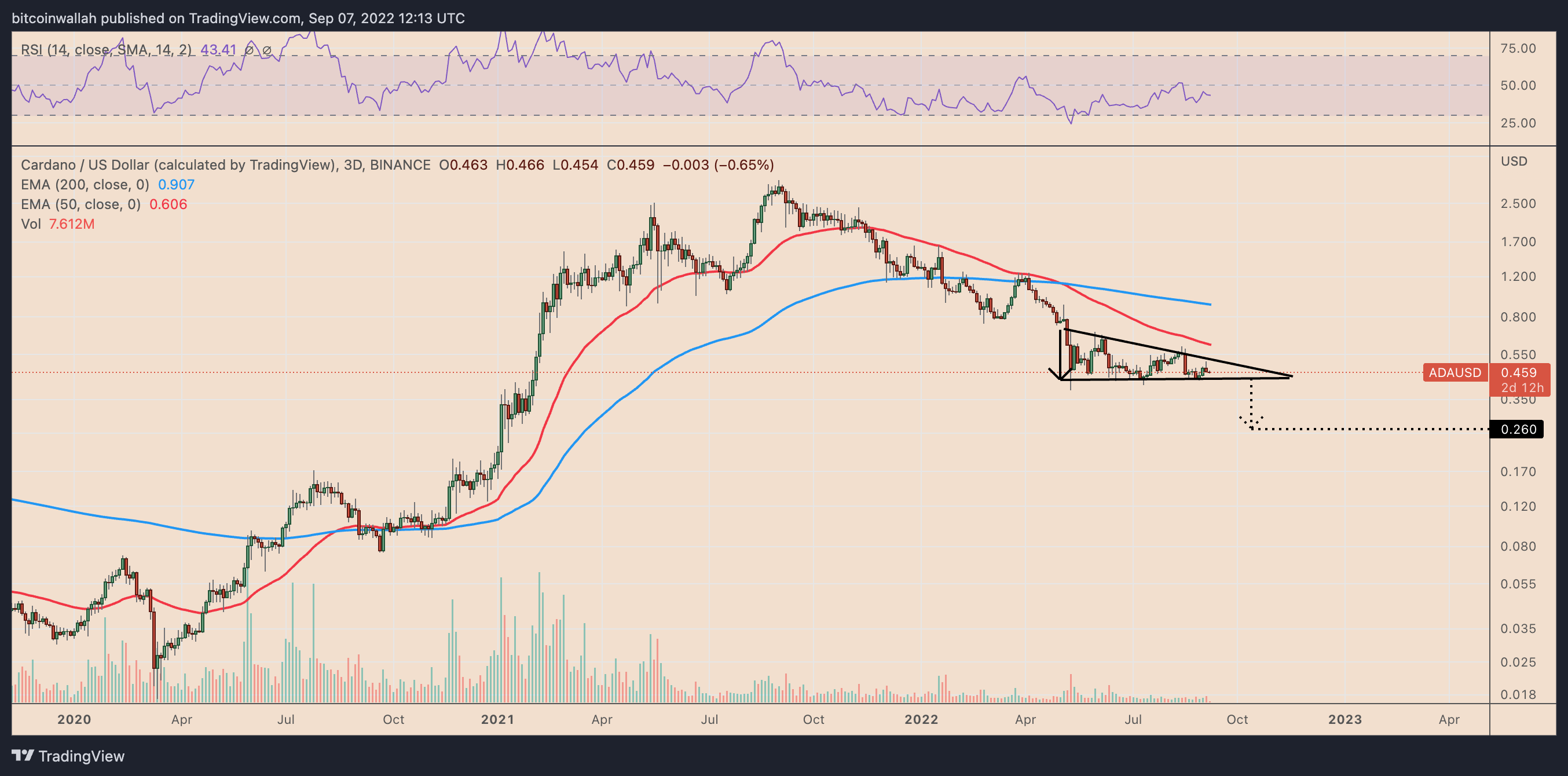 ADA risks dropping to $0.26 if it decisively breaks below its descending triangle’s lower trendline, as per rules of technical analysis. In other words, a nearly 40% price decline from current prices.