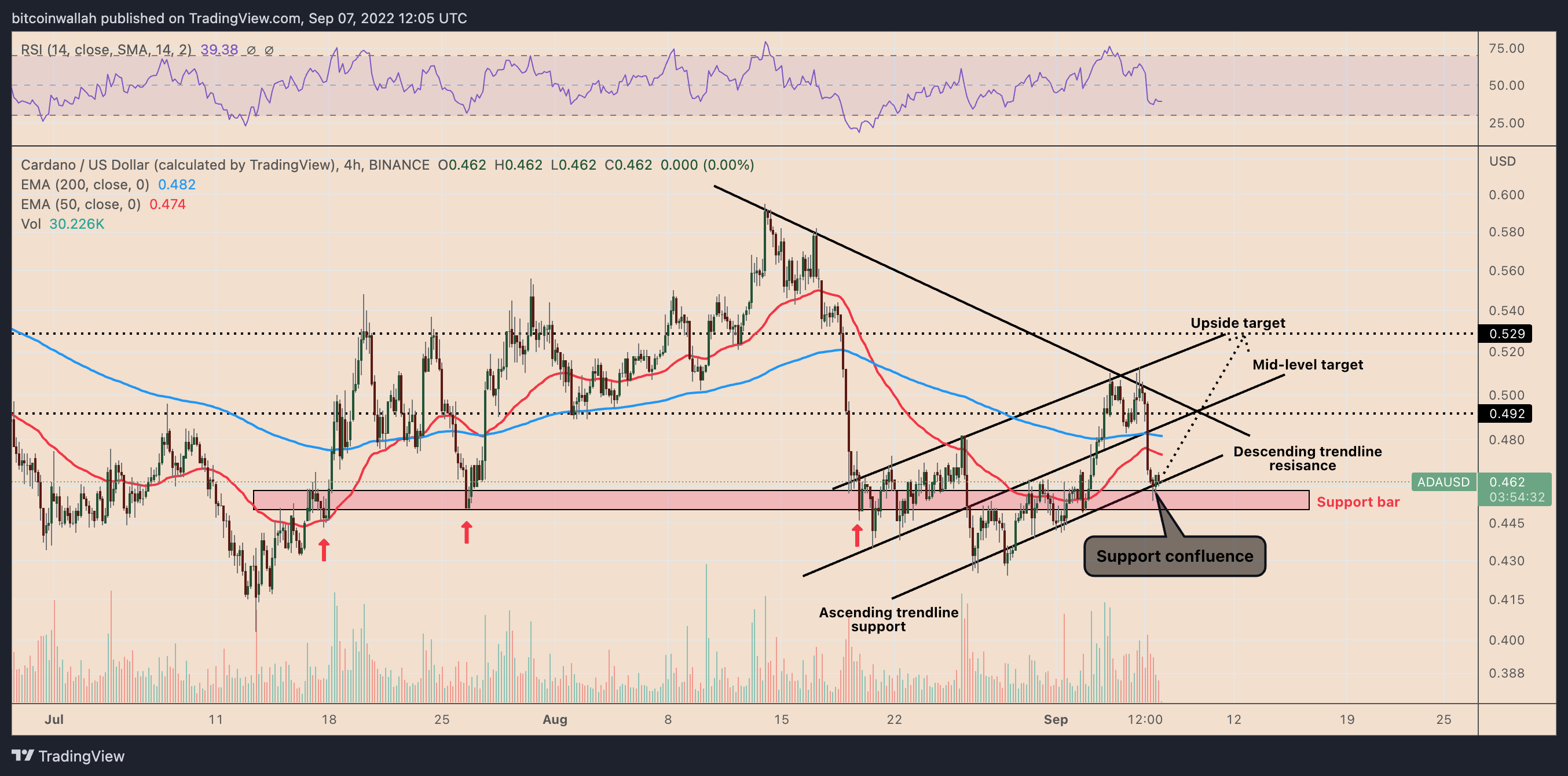On the four-hour chart, ADA’s price tests a support confluence for a potential rebound move. This confluence is made up of a multi-week ascending trendline and a support bar highlighted in the chart below.