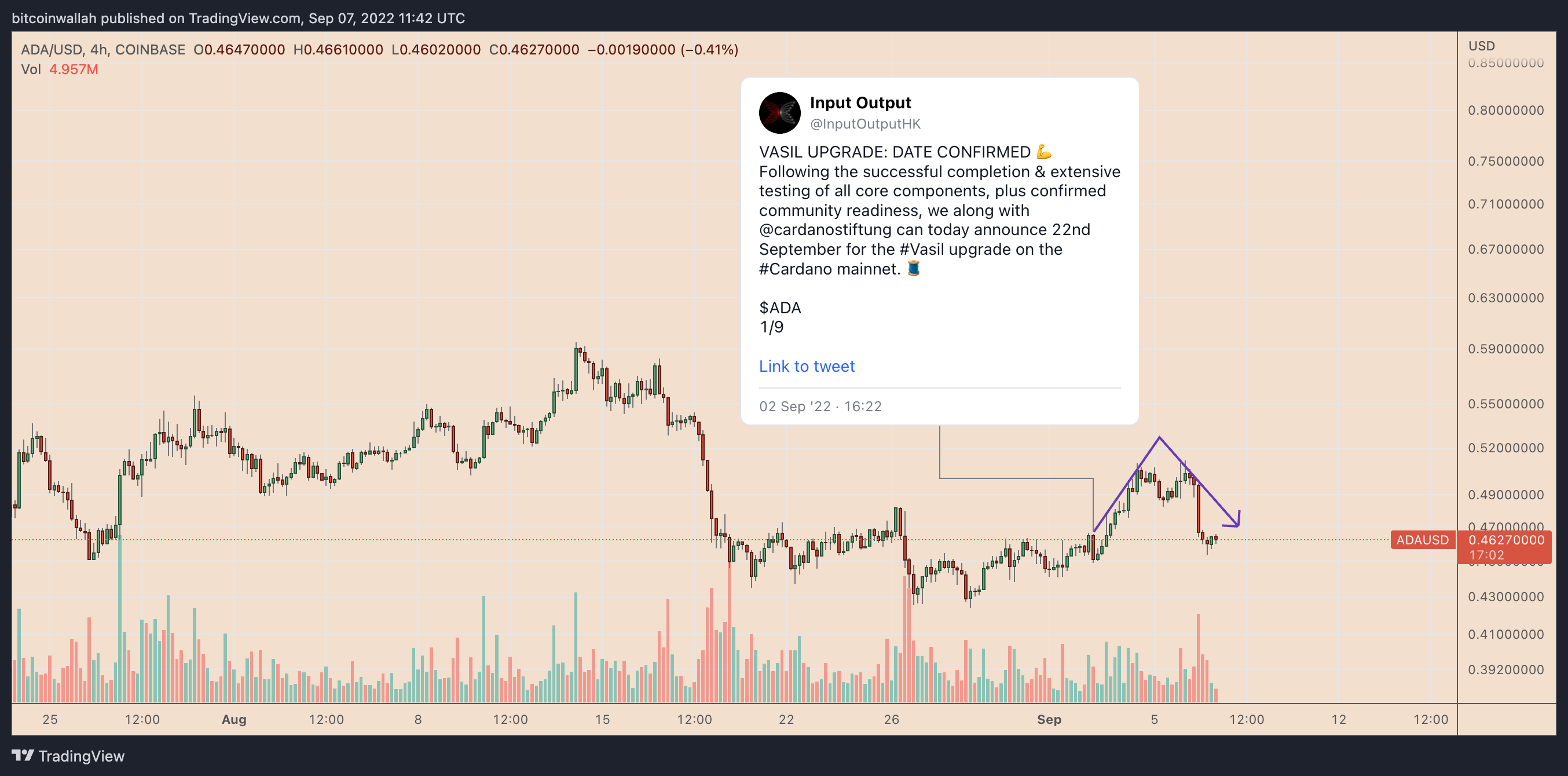 In detail, ADA’s price has risen approximately 3.5% to $0.51 since the Vasil launch announcement, including a circa 14% rally followed by its near-perfect wipeout. In other words, traders initially bought the Vasil hype but were quick to exit markets, as illustrated by the price action below.