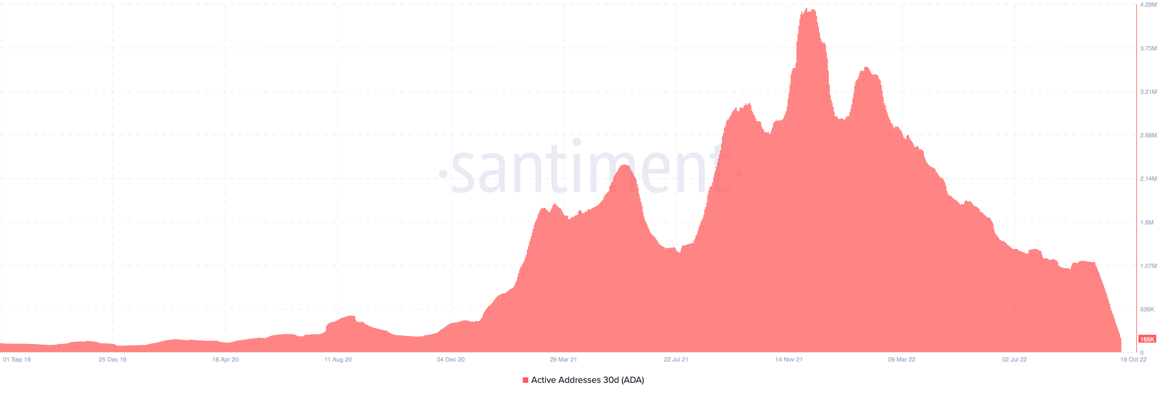 Notably, its 30-day DAA average dropped to 165,000 on Oct. 19, its lowest level in two years, data from Santiment shows.